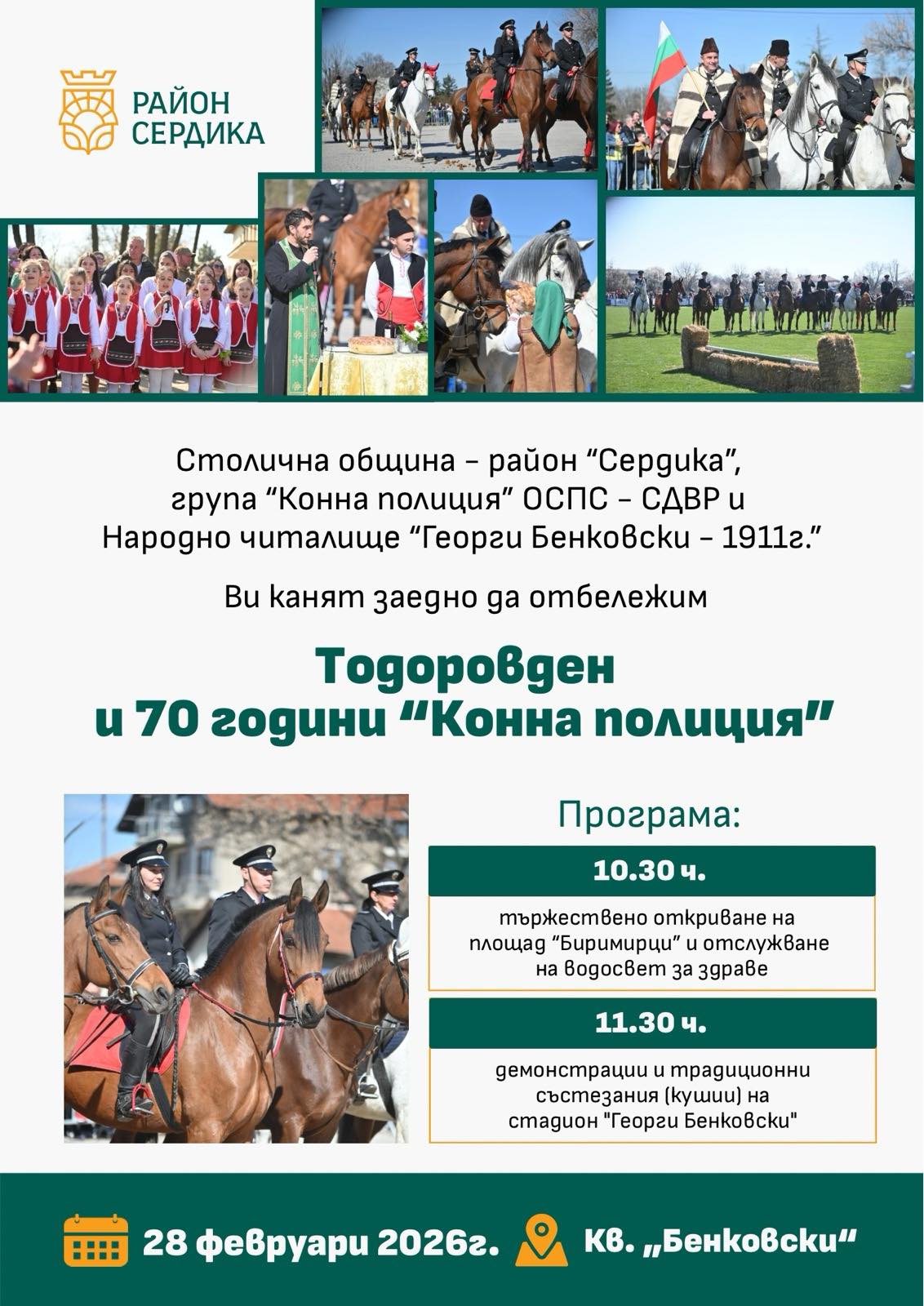 Заповядайте да отбележим заедно един от най-обичаните пролетни празници – Тодоровден! На 28 февруари (събота) кв. „Бенковски“ ще се превърне в център на традициите, спортния дух и празничното настроение. Организатори на събитието са Столична община – район „Сердика“, Народно читалище „Георги Бенковски – 1911“ и Група „Конна полиция“ – ОСПС – СДВР.
